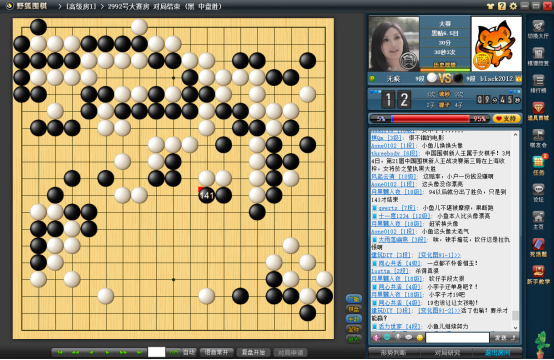 老一辈快刀折戟不久,新生代快刀上演辣手摧花。3年前的新人王战决赛,於之莹激战三局爆冷击败李钦诚,书写下女棋手登顶男子比赛的女王传说。三年后屡次问鼎快棋赛冠军的black2012(李钦诚九段)已是金冠加身,自然不肯重蹈覆辙。中盘战,无痕一条横贯棋盘的白龙被钦仔一刀两断,14颗白子沦为黑棋盘中餐。白棋无法在别处弥补如此惨痛的损失,棋局仅弈141手戛然而止。