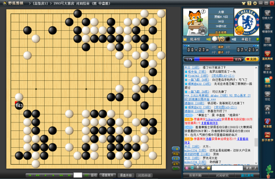 棋迷们正在为同时进行的8盘对决目不暇接,昔日闻名天下的快刀陆承轩(罗洗河九段),再次习惯性的头一个结束战斗。只可惜人老不已筋骨为能,面对比自己小20岁的棋手,年过四旬的罗九段难以将自身功力稳定输出,左下角被对手机敏揪住形成劫杀。你来我往的劫争进行了近60手,执白的罗洗河劫材耗尽,只能无奈认输。
