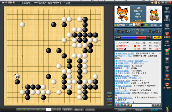身为刚刚在农心杯上阻击申旻埈并达成三连胜,一己之力扭转中国队颓势的擂台英雄。我想静静了(党毅飞九段)与NIPOHC(韩一洲六段)一战理所当然的成为众人关注的焦点。执白的静静延续着擂台赛上的好状态,一开始即将局面倒向乱战。黑棋好不容易将各处安置妥当,白86犀利一碰如影随形,引来围观群众阵阵喝彩。