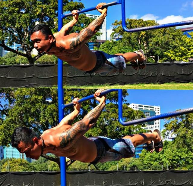 那么看起来很厉害的后水平,到底是怎么练习的呢?这个动作需要练两个比较基础的部分,一个是引体向上,另外一个是举腿。