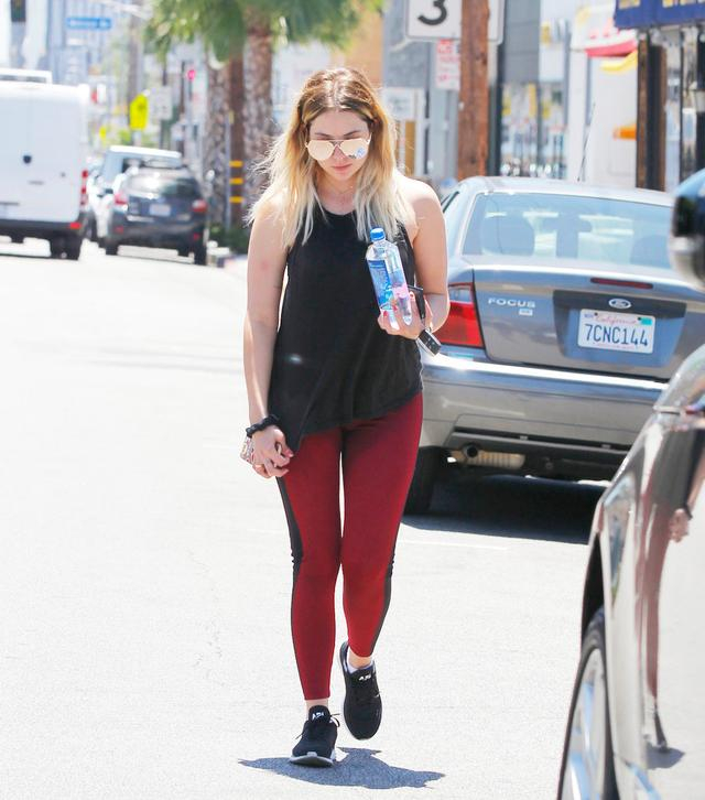 6月27日,阿什利·本森(Ashley Benson)穿着黑色的背心和褐红色的紧身裤出现。