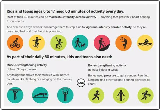 3、对于6至17岁青少年,建议的身体活动量是相同的。每天,6至17岁的青少年需要至少60分钟的中等至剧烈活动才能从身体活动中获得最大的健康益处。大多数活动都可以是有氧运动,如散步、跑步或任何让他们的心跳更快的活动。他们还需要能够锻炼肌肉和骨骼的运动,比如在游乐场设备上攀爬、打篮球和跳绳。