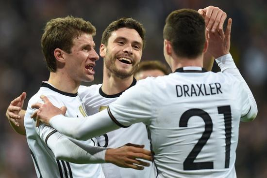 德国(4-2-3-1):22-特尔施特根/16-吕迪格,2-穆斯塔菲,5-胡梅尔斯,3-赫克托(85'15-金特尔)/18-克罗斯(90'20-克拉默),4-鲁迪/19-格策(61'11-罗伊斯),8-厄齐尔,21-德拉克斯勒(85'27-福兰德)/13-穆勒(69'14-埃姆雷-詹)