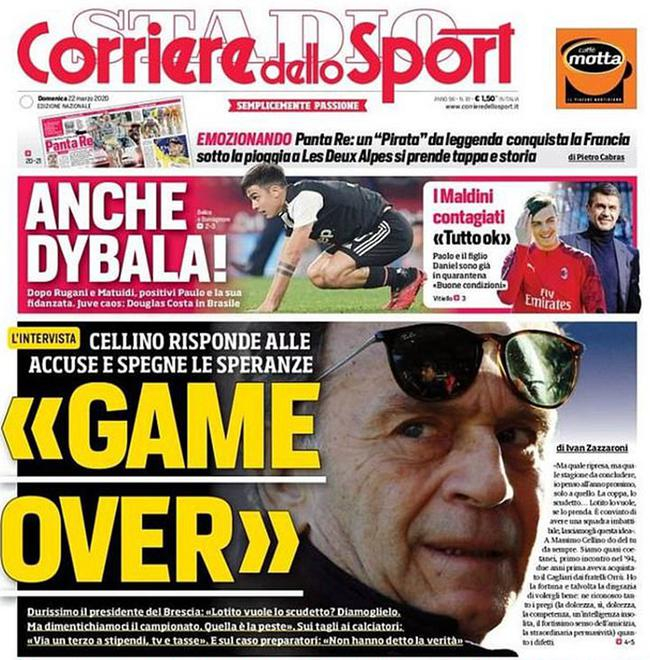 意大利总理孔蒂已表示,所有国家禁令和场所关闭将延长数周,如果不是数月的话。都灵俱乐部主席卡伊罗称,在总理孔蒂所称的二战以来意大利的最大灾难期间,思考足球是“疯狂的”,他表示,来自本地区的俱乐部基本上设法避免了疫情爆发,但“基于传染数据主张恢复赛事是愚蠢的”,“在局势不断变化的情况下,说我所在地区没有问题毫无意义。”