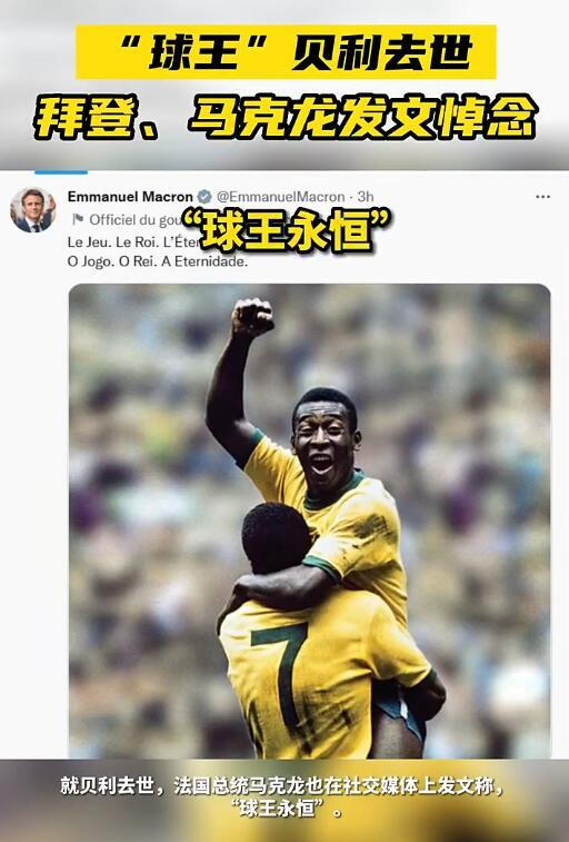 北京时间12月30日讯 ,球王贝利不幸离世,享年82岁。法国总统马克龙和法国总理伊丽莎白-博尔内均发文向贝利的离去表示哀悼。