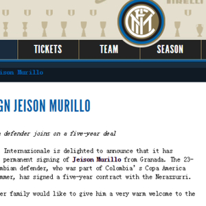 上个月穆里略随哥伦比亚队征战了美洲杯比赛,在小组赛1比0战胜巴西队的比赛中,正是他打进了全场唯一进球。国米今天的官方公告中称:国际米兰俱乐部高兴的宣布我们已经与杰森-穆里略完成签约,23岁的他与俱乐部签约5年。
