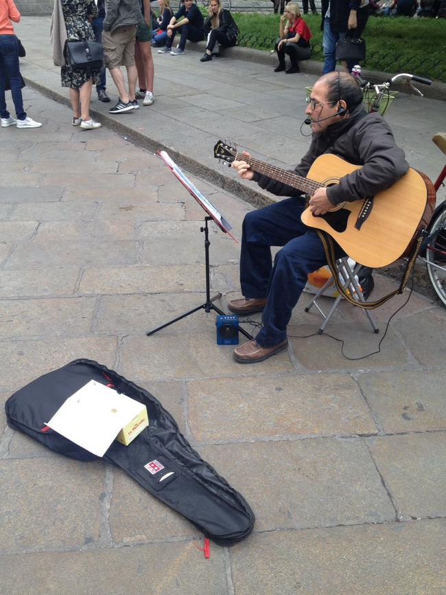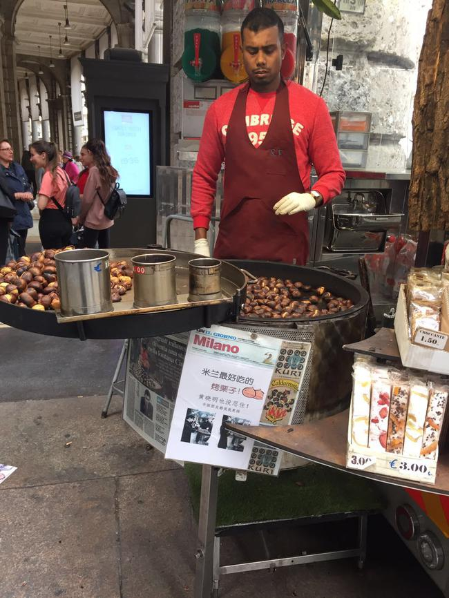 走在米兰城的街道上,你能感受到这座都市的兼收并蓄,能发现各个国家的元素。有光鲜亮丽的年轻人,看着他们你会惊叹这里不愧为时尚之都;有席地而眠的本地流浪汉,在大教堂前弹吉他吹萨克斯的街头艺人;有偷抢拐骗的吉普赛女人和小孩,越是漂亮可爱你就越要离他们远点;有往你手上缠红绳要钱的非洲难民,郜林也曾中过他们的套……中国元素同样不少,街上的中国旅客越来越多,中餐馆的生意越来越好,在一个卖栗子的小摊上甚至发现了专向中国人推销的小广告——黄晓明在这家小摊买栗子的照片和新闻报道,并用简体汉字写着:“米兰最好吃的烤栗子!黄晓明也没忍住!中国朋友都说我更帅。”
