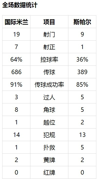 上半时斯帕尔没有1脚射正,但进攻仍有相当威胁。下半时,若昂-马里奥传球,佩里希奇射门被萨拉蒙挡出底线。博尔哈-巴莱罗远射被戈米斯得到。什克里尼亚尔受伤倒地,好在并无大碍。斯帕尔右路任意球传中,伊卡尔迪凌空解围险些自摆乌龙。