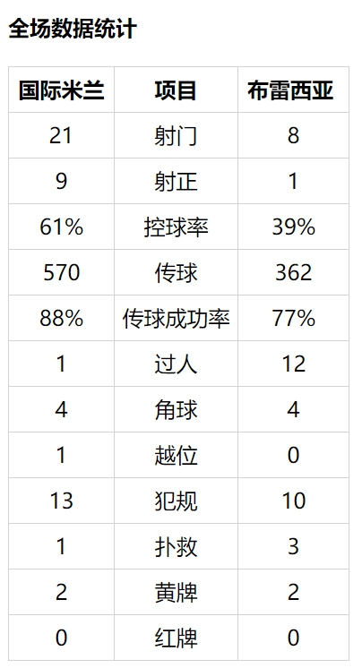上半时布雷西亚0射正。下半时,拉诺基亚换下德弗赖。加利亚尔迪尼中路直传,博尔哈-巴莱罗背身做球,劳塔罗-马丁内斯在门前13米处转身打高。桑切斯第52分钟再次贡献助攻!他右侧任意球斜传,加利亚尔迪尼前点距门6米处头球蹭入近角,4比0。