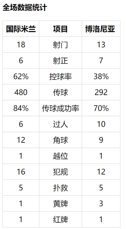博洛尼亚第80分钟反超!多明格斯反击中及时转移到禁区左侧,巴罗在门前9米处左脚推进远角,2比1。埃斯波西托和比拉吉出场,换下劳塔罗-马丁内斯和阿什利-扬。国米最终无力挽回败局,博洛尼亚成为唯一近2个赛季均在客场击败国际米兰的球队。