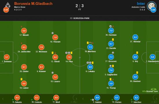 国米vs门兴评分:卢卡库双响8.9最高 普莱亚次席