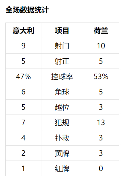 两队失误都比较频繁。荷兰第37分钟才有首次射门,德利赫特传球,德佩在门前25米处连续扣球射门偏出右门柱,这也是荷兰上半时唯一射门。5分钟后,若日尼奥送出过顶球,维尔迪反越位外脚背射门被西莱森托出横梁!他开出角球,克里希托头球一蹭被门线上的福默破坏。