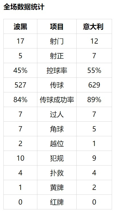 意大利(4-3-3):21-唐纳鲁马(88'戈利尼)/7-弗洛伦齐,19-博努奇,15-阿切尔比,3-埃默松/18-巴雷拉,8-若日尼奥,6-托纳利/20-贝尔纳代斯基(75'沙拉维),9-贝洛蒂,10-因西涅(86'卡斯特罗维利)