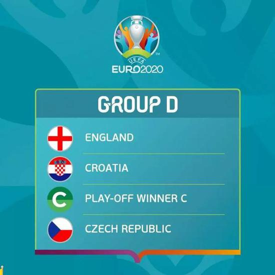 英格兰被分在D组,同组对手是克罗地亚、捷克和附加赛出线球队;