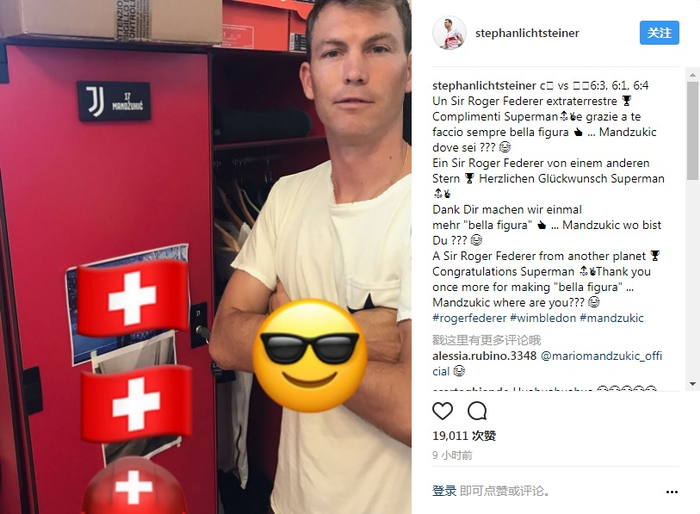 费德勒创纪录地第八次赢得温网,身为同胞的利希施泰纳深感高兴,由于费德勒战胜的是克罗地亚人西里奇,师太也在Instagram上调侃了“不高兴先生”曼朱基奇:“外星人费德勒,祝贺超人,你永远是榜样……曼朱你在哪里?”