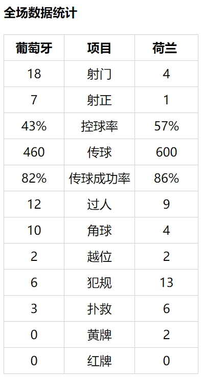 荷兰近4届大赛决赛3负,仅1998年欧洲杯夺冠,与葡萄牙近13次交锋仅2胜(4平7负),作客葡萄牙从未取胜(2平3负)。科曼沿用半决赛补时逆转英格兰的首发阵容。