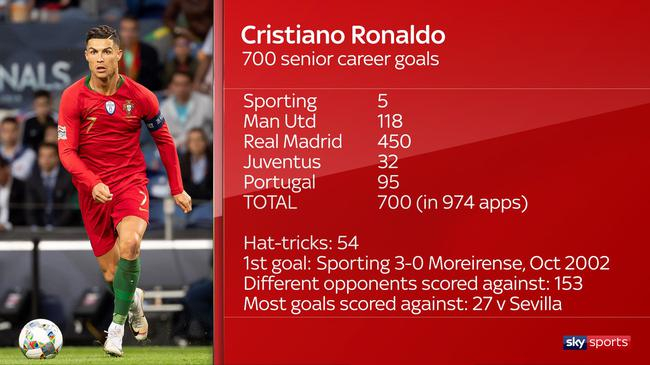 在对阵乌克兰的欧预赛中,C罗完成进球,将自己职业生涯的总进球数刷新到了700粒,他也成为现役球员中唯一一位职业生涯打进700球的球员。