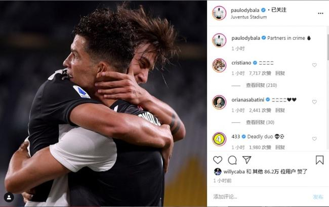赛后,迪巴拉在个人社交媒体上晒出和C罗深情相拥的照片,并配文:“这就是犯罪团伙!”