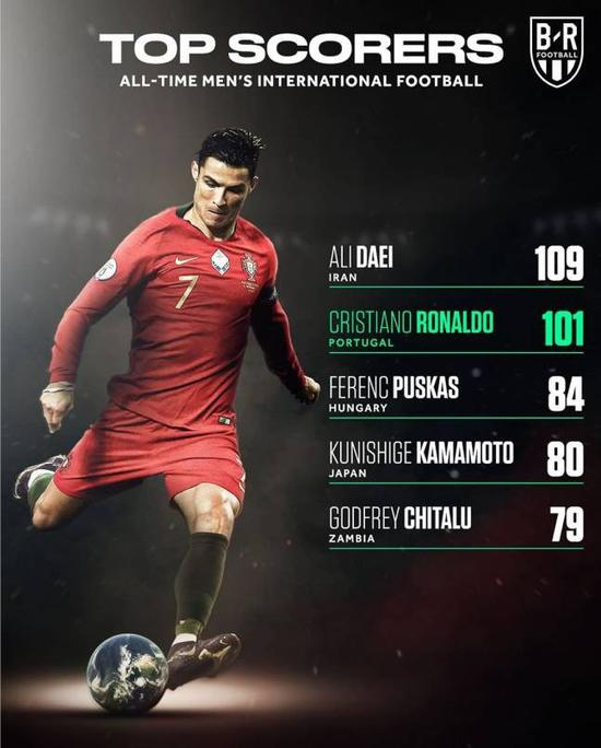 排名第三的是匈牙利传奇普斯卡什,他有84球入账,上个世纪70年代的日本国脚釜本邦茂有80球入账排第四,赞比亚传奇射手戈弗雷-奇塔卢有79球入账,这三位都是“上古时代”的球员。目前的21世纪暂未有球员的国家队进球数据能与C罗相提并论。
