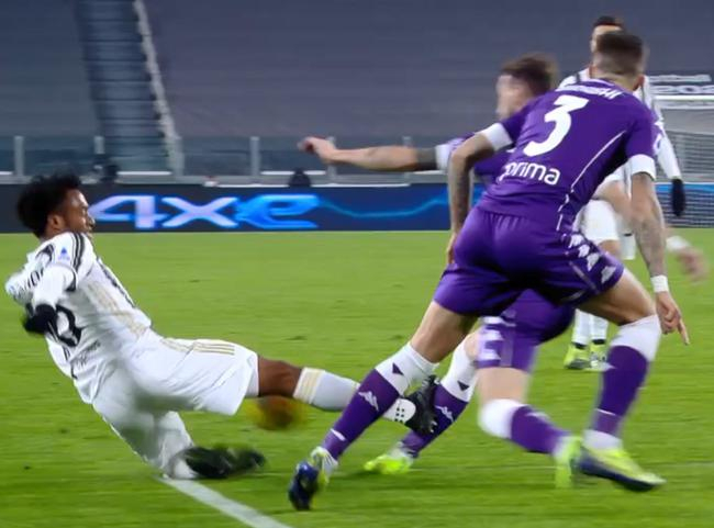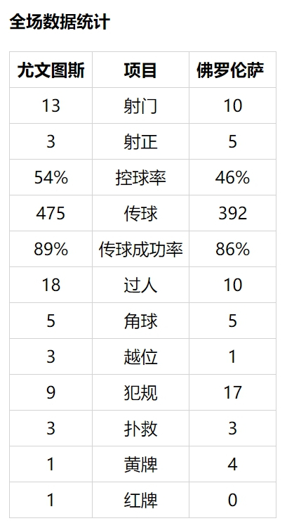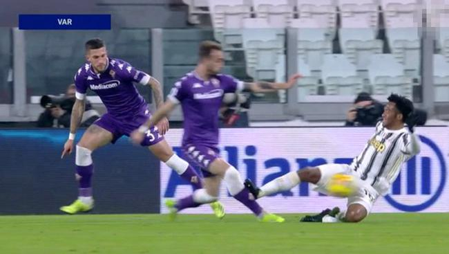 尤文第16分钟再遭打击,夸德拉多右肋突破时铲倒卡斯特罗维利,主裁判拉佩纳亮出黄牌,佛罗伦萨队员继续抗议,拉佩纳到场边观看VAR回放,认定夸德拉多蹬踏对方右小腿,将黄牌升级为红牌!他连续2年在12月吃到直红,又将停赛3场。尤文图斯并列本赛季欧洲5大联赛吃到红牌最多的球队(5红)。