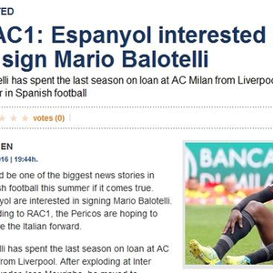 《意大利足球》表示西甲球队西班牙人目前对巴洛特利很感兴趣,《意大利足球》同时表示,AC米兰已经表态希望从利物浦继续租借巴洛特利一个赛季,因此两支球队成了竞争对手。