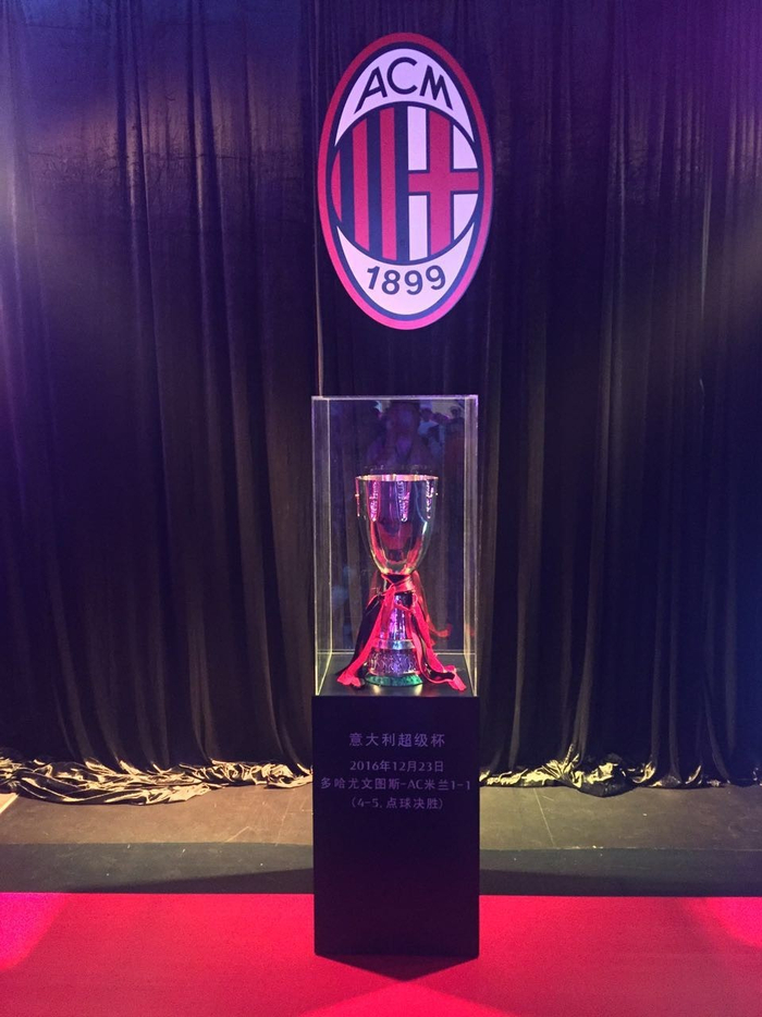 借来华参加2017国际冠军杯比赛之机,米兰俱乐部在广州正式举办了“中于米兰”AC米兰中国行新闻发布会暨中国下一代教育基金会合作意向书签约仪式。在发布会大厅外,米兰俱乐部首先精心布置一道荣誉长廊,里面不仅有米兰历史上的功勋球员展示和历史介绍,还特别将球队最近获得的一座冠军奖杯——意大利超级杯进行了现场展示,不出所料地吸引了与会者的纷纷合影。