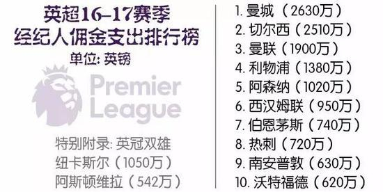 曼联单买博格巴就破纪录花了1亿,两个转会窗共计给经纪人掏了1900万;利物浦支出1380万;阿森纳则是1020万——这5支球队在经纪人佣金一项支出都超过了1000万。而冲超成功的纽卡斯尔,也在佣金一项超过了1000万。