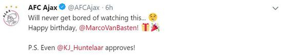 阿贾克斯官推:这个进球百看不厌!生日快乐范巴斯滕!P.S. 连亨特拉尔都觉得牛
