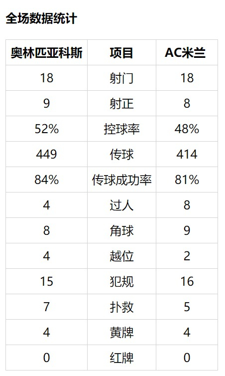 恰尔汉奥卢反击分球,伊瓜因左路内切,禁区前沿推射偏出右门柱。凯西左路传中,卡斯蒂列霍在门前10米处推射被若泽-萨得到。AC米兰第69分钟再丢一球!奥林匹亚科斯左路传中被萨帕塔顶出,吉列尔梅在门前26米处停球抽射被萨帕塔左脚尖一挡变成诡异吊射入左上角,2比0!在即时积分榜上,AC米兰与奥林匹亚科斯积分持平,但因为客场进球少跌至小组第三!