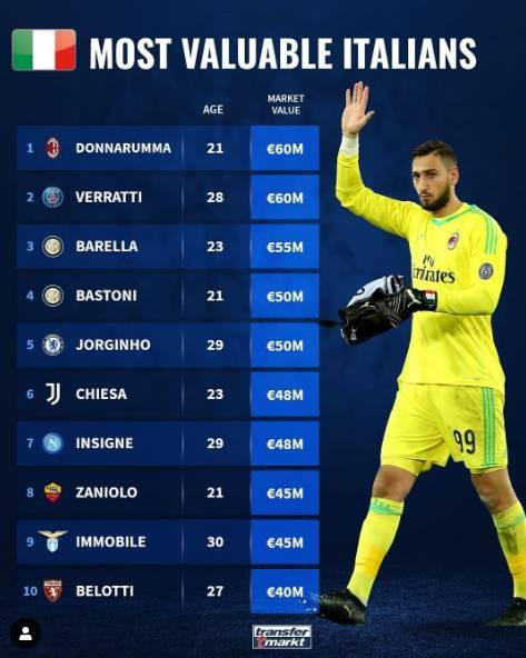 直播吧1月12日讯 德国《转会市场》公布了意大利球员最新身价榜,米兰门将多纳鲁马以6000万欧元居首,维拉蒂和巴雷拉分列二三位。