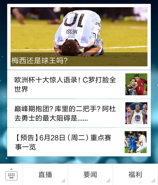 新浪体育微信公众号今日推送依然精彩不断:欧洲杯十大惊人语录!C罗打脸全世界;巅峰期抱团?库里的二把手?阿杜去勇士的最大阻碍是……更多精彩,尽在新浪体育微信公众号!