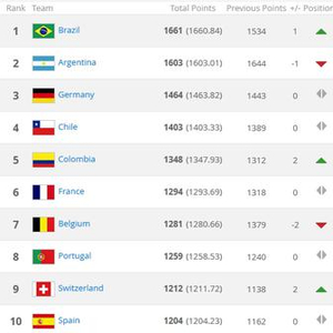 除此之外,德国队位居第三位,是所有欧洲国家排名最高的,瑞士队挤入前十位列第9,传统列强葡萄牙、西班牙、意大利和英格兰分居第8、第10、第12和第14位。