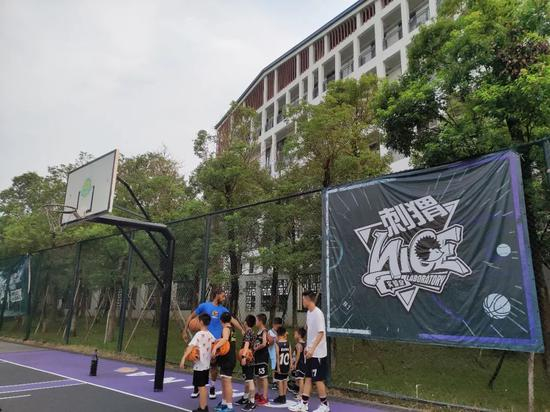 陈晓斌(右)与阿德在东莞训练喜欢篮球的孩子们。