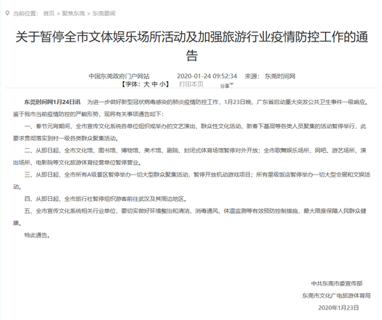 随后,东莞也紧接着发布了关于暂停全市文体娱乐场所活动的通告。