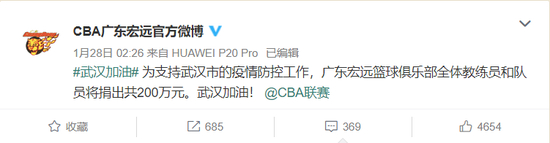 为支持武汉市的疫情防控工作,广东宏远男篮通过官方微博宣布,全体教练员和队员将捐献200万元。