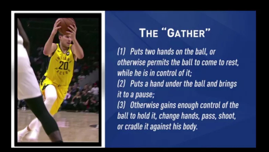 在这个案例中,没有符合条件 2 或 3 的情况出现,所以这名球员双手拿球的那一刹那判定为收球(Gather),此时他的右脚在地。之后,他完成并步跳起投篮,完全符合行进间运球结束收球后还可以迈出两步的规则。