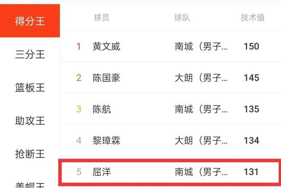 代表南城出场9次,系列赛总得分131分,排名第五;三分命中数排名第四,抢断并列第二。
