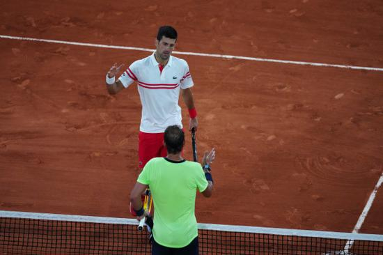 6月11日,纳达尔(下)与焦科维奇赛后致意。新华社记者高静摄