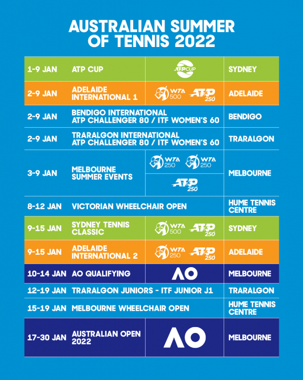 澳网协表示,2022年澳网开赛前的系列热身赛将达到创纪录的17场,包括将在悉尼举行的ATP杯、悉尼网球经典赛,在南澳州首府阿德莱德举行的阿德莱德国际赛,以及在墨尔本举行的两场WTA250赛事和一场ATP250赛事等。