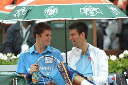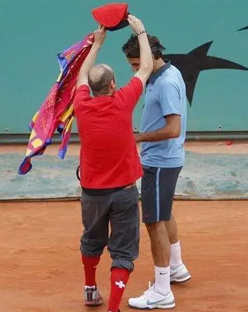2014年法网首轮,小德的比赛因雨推迟,干坐着无聊的小德请身后为自己撑伞的小球童一起坐下聊天,为他打伞,请他喝饮料。这样的待遇可是多少人羡慕不来的啊!
