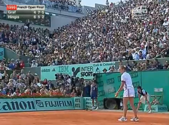 1999年法网女单决赛,瑞士公主辛吉斯在6-4/5-7/2-5大比分落后情况下使用了下手发球,还拿下了这一分。这一举动引来了全场的嘘声,最终辛吉斯输掉了那场决赛。赛后,瑞士姑娘嚎啕大哭,甚至拒绝参加颁奖仪式,最终在母亲劝说下才擦干泪水。