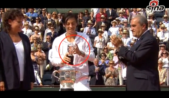 在2011年法国网球公开赛女单决赛中,中国金花李娜以2-0战胜了斯齐亚沃尼,成为了首位捧起大满贯女单奖杯的亚洲球员。在颁奖典礼上出现了乌龙一幕,颁奖嘉宾错把给李娜留念的迷你复刻版奖杯错颁给了亚军得主。
