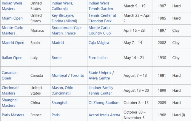 目前的九项ATP1000大师赛中,室内只有一项,也没有草地大师赛,而这是费德勒最擅长的两种场地类型。在纳达尔喜爱的红土场,则设有三项大师赛。