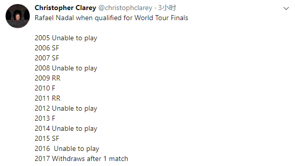 他此次当然不仅仅只是第八次入围总决赛,从2005到2017,纳达尔其实是连续13年入围,这是一项足以说明他职业生涯长久并且稳定的记录。然而,由于纳达尔职业生涯饱受伤病困扰,尤其赛季末又是他的伤病高发时段,他竟已有多达五次因伤退赛总决赛。