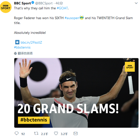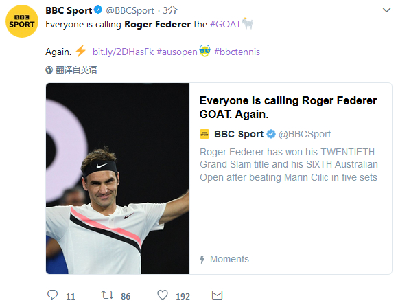 费德勒夺冠后,世界媒体争相报道,BBC体育这样写道:再一次,每个人都要叫他GOAT(史上最佳)