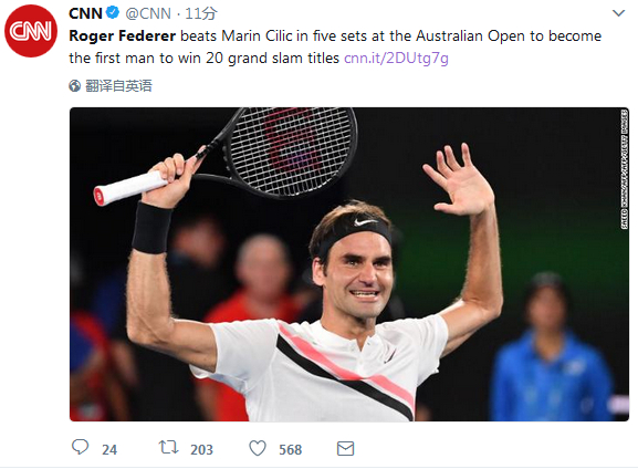CNN:费德勒成为了第一位赢得大满贯第20冠的男球员。
