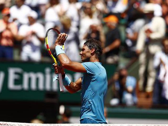 6月7日,纳达尔庆祝比赛获胜。新华社记者罗欢欢摄