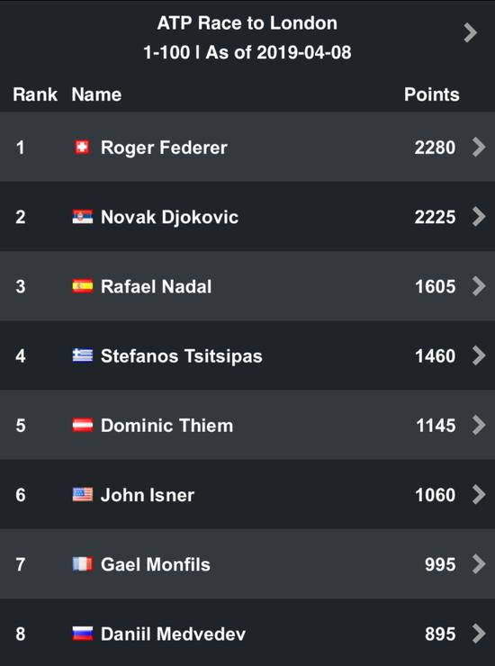 随着印第安维尔斯和迈阿密两站大师赛结束,男子网坛为期三个月的开年硬地冠军争夺战告一段落。在通往伦敦总决赛的冠军积分榜上,新赛季斩获迪拜和迈阿密两座桂冠的费德勒以 2280 个积分力压澳网冠军德约科维奇的 2225 分位居第一,澳网亚军纳达尔则以 1605 分排名第三,打进澳网四强的希腊新秀西西帕斯排名第四,印第安维尔斯站冠军蒂姆排名第五。