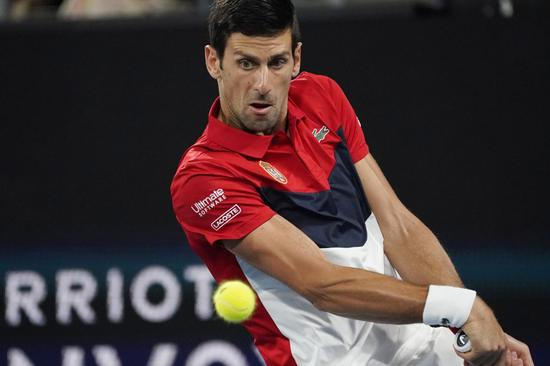 1月12日,塞尔维亚队选手焦科维奇在ATP杯网球赛中回球。新华社/欧新