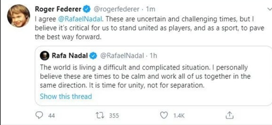费德勒转发了纳达尔的表态,并补充道,“无论是作为球员,还是作为网球这项运动,我们都需要团结一心向前走。”